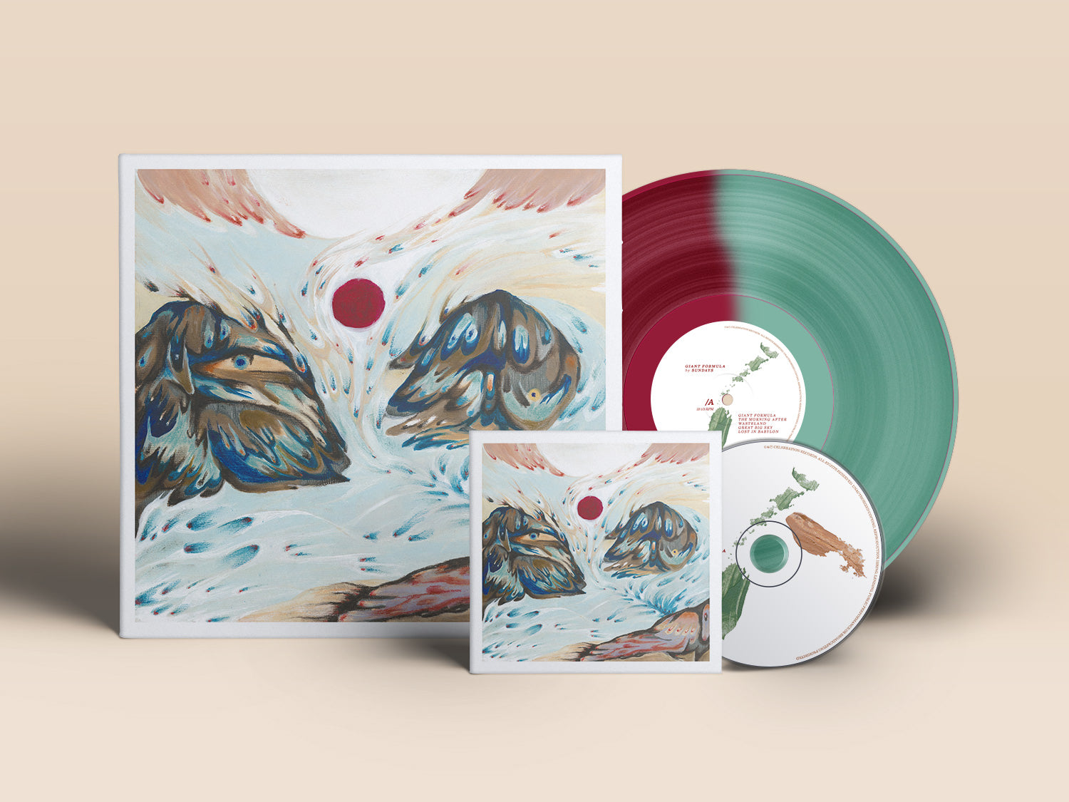 It is pressed on deluxe HQ 180 gram vinyl and it comes in a beautiful gatefold cardboard sleeve with printed innersleeves. It is available as a limited edition bi-colour mint green/dark red LP, a standard edition mint green LP and compact disc.